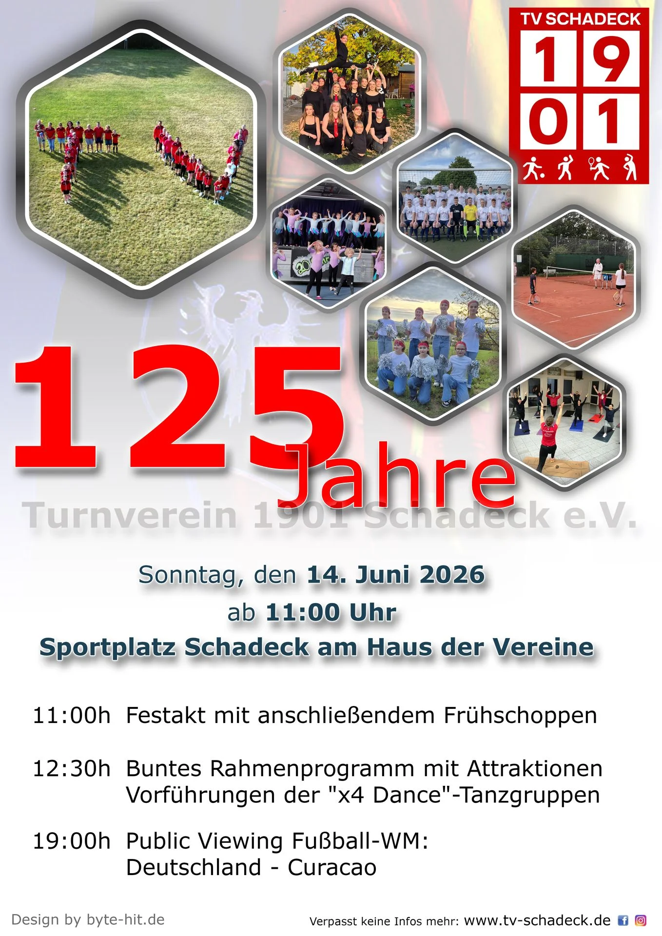 125 Jahre TV SchadeckBernd Hintschitz25. März 2026News Am 14. Juni 2026 feiern wir Jubiläum: 125 Jahre TV Schadeck e.V. Unsere bisherigen Jubiläen » Vorheriger Beitrag Ehrungen beim TV Schadeck
